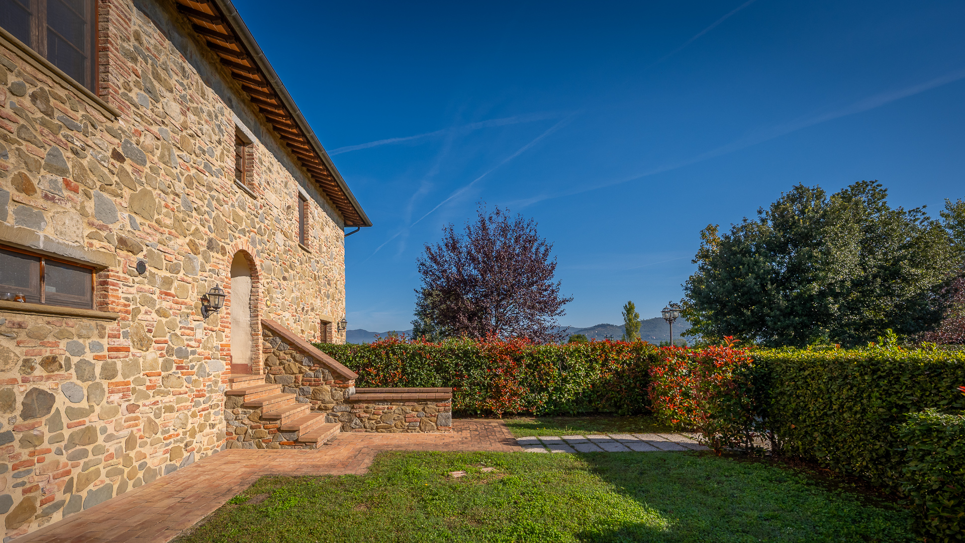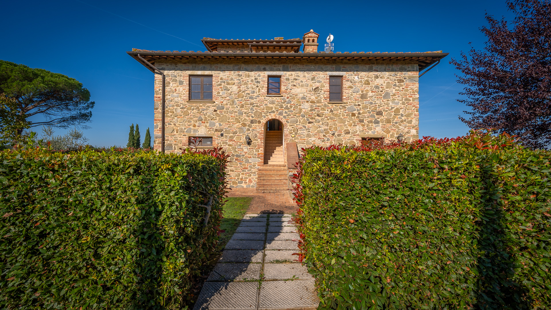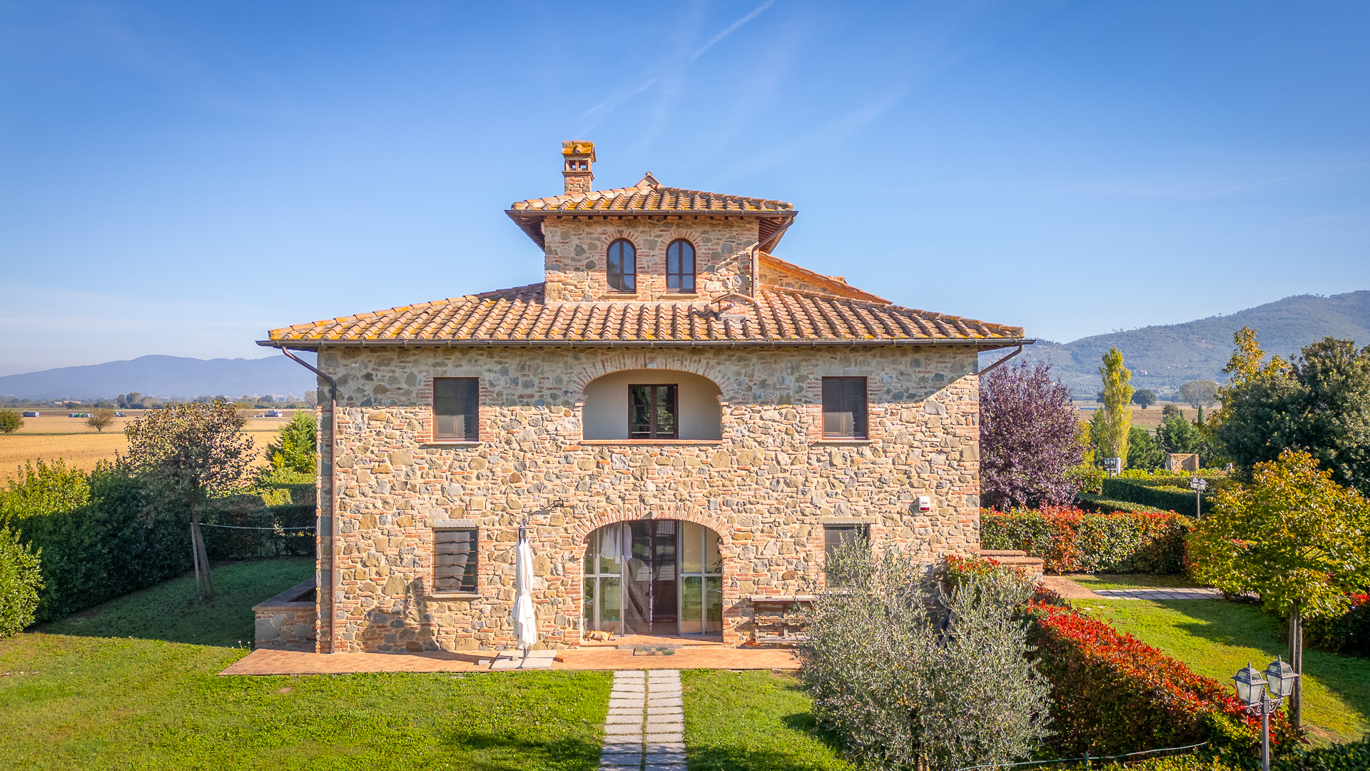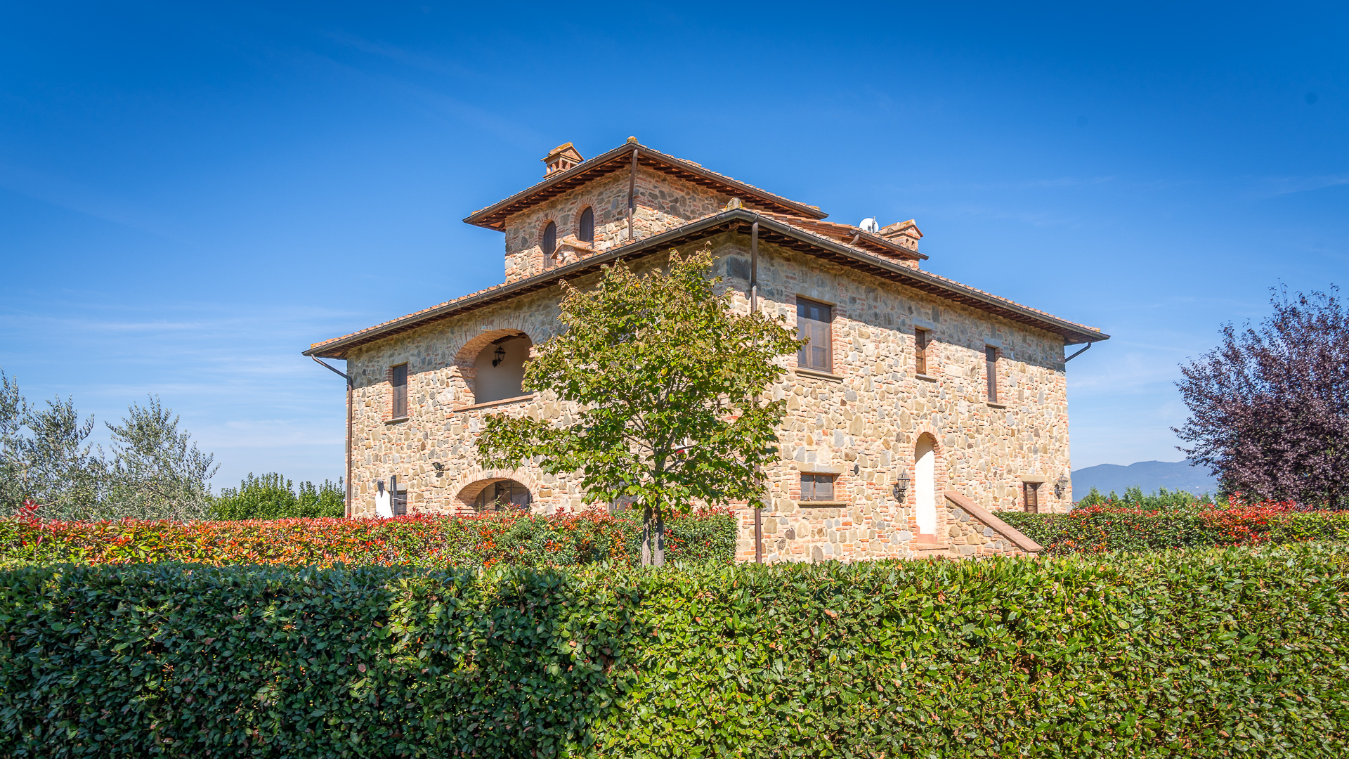W niewielkiej odległości od zabytkowego centrum Cortony, w ekskluzywnym kompleksie mieszkalnym, oferujemy na sprzedaż elegancki kamienny dom, w pełni odnowiony. Nieruchomość, rozmieszczona na trzech poziomach, zajmuje łączną powierzchnię 411 m2 i jest podzielona na trzy jednostki mieszkalne w następujący sposób: Apartament 1: na parterze, gościnne patio prowadzi do rezydencji, z wejściem, kuchnią z jadalnią, jasnym salonem z kominkiem i łazienką z prysznicem. Część sypialna na pierwszym piętrze obejmuje główną sypialnię z zadaszonym tarasem, drugą sypialnię i dodatkową łazienkę z prysznicem. Apartament 2: znajduje się na pierwszym piętrze, do którego prowadzą piękne zewnętrzne schody. Wejście otwiera się na salon z kominkiem i zewnętrzną loggią, kuchnię i dwie sypialnie z łazienkami. Na drugim piętrze, w uroczej wieżyczce mieści się gabinet. Apartament 3: na parterze duża weranda wprowadza do rezydencji, składającej się z salonu z kominkiem, kuchni i dwóch sypialni dwuosobowych, obie z łazienkami. Na poziomie piwnicy znajdują się piwnice każdego z apartamentów, wykorzystywane jako wygodne schowki. Na zewnątrz nieruchomość otoczona jest starannie utrzymanym prywatnym ogrodem o powierzchni 1800 m2, z potencjałem budowy ekskluzywnego basenu. Obecnie mieszkańcy mają dostęp do wspólnego basenu znajdującego się na terenie zamkniętego wspólnego parku, wyposażonego w solarium.