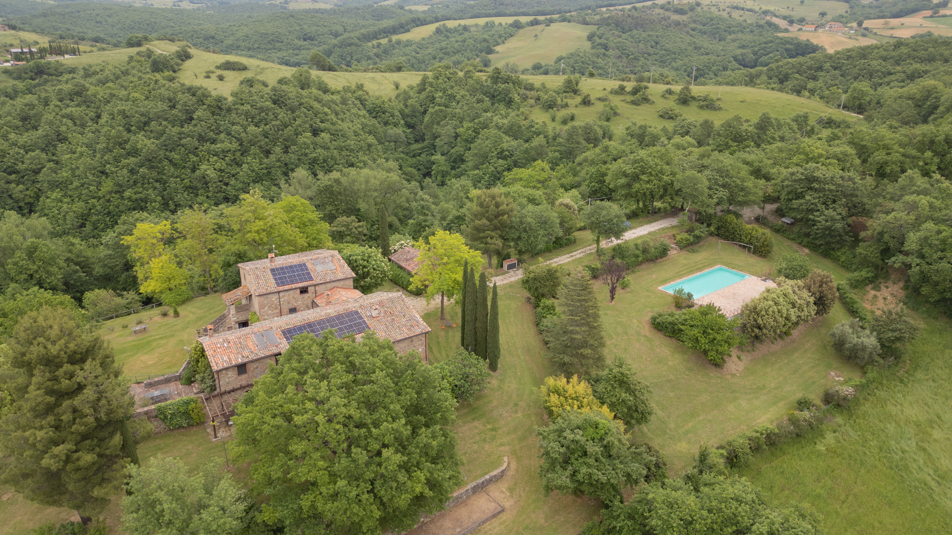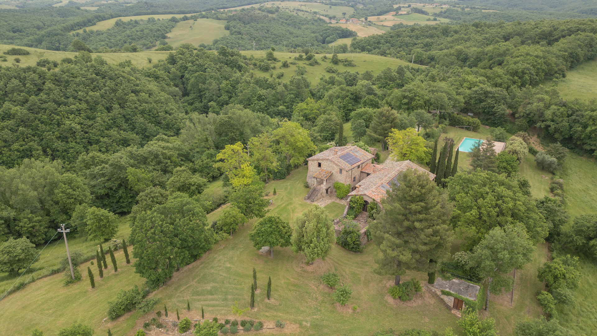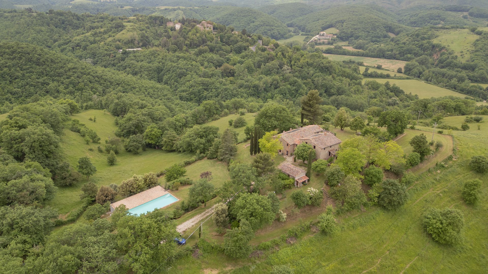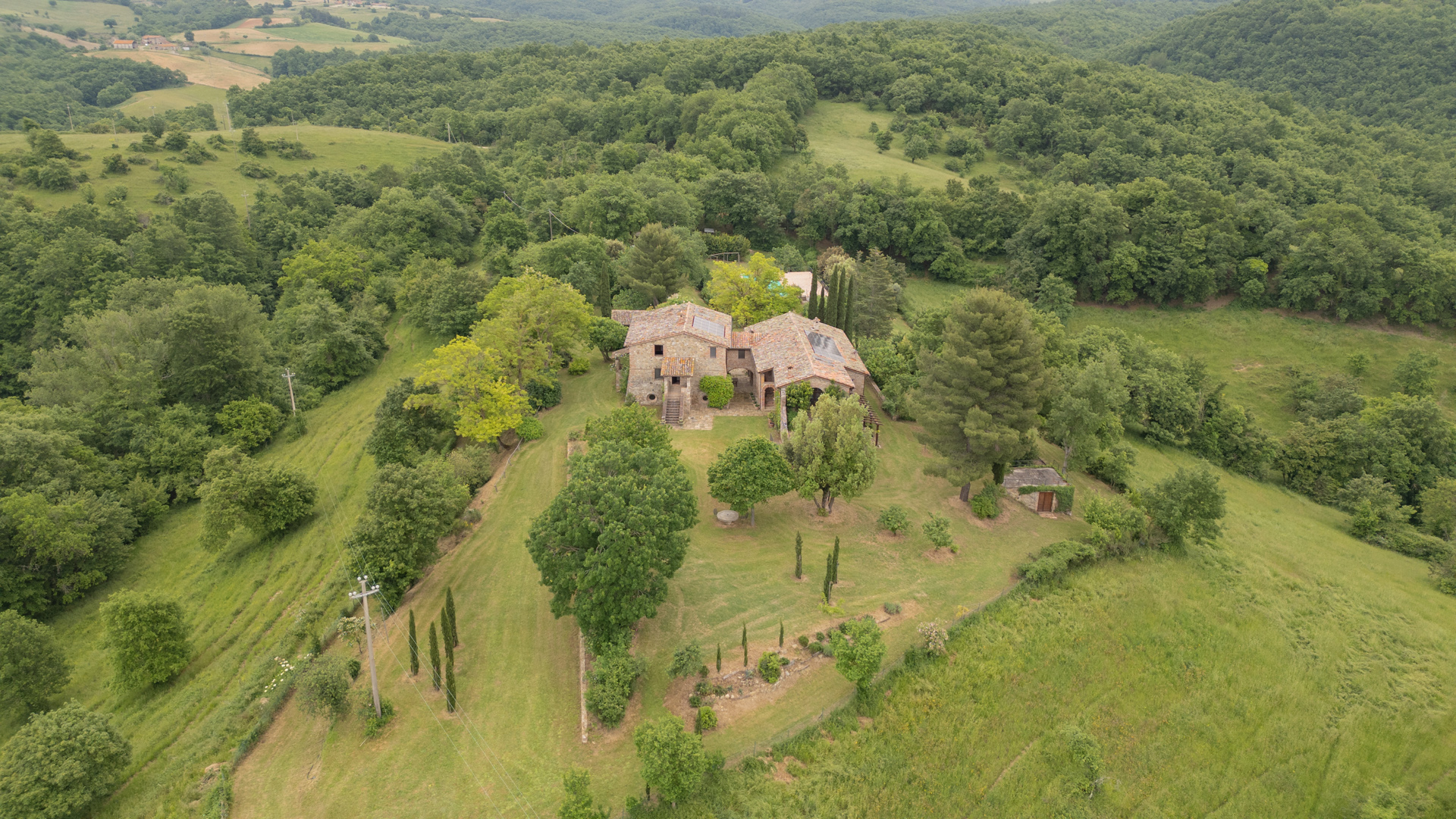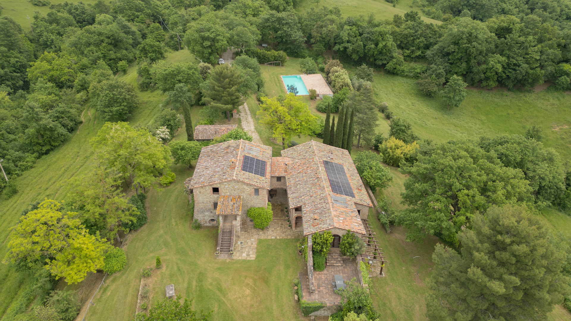 Nieruchomość położona jest na wzgórzu (480 metrów nad poziomem morza) z widokiem na piękną i nieskażoną dolinę Umbrii, bogatą w lasy i łagodne grzbiety. Zbudowana w pobliżu starożytnej etruskiej drogi, która łączyła Orvieto i Perugię z Toskanią, nieruchomość została odnowiona w dwuletnim okresie 2022-2023, zachowując autentyczność i rustykalny urok XVII-wiecznej wioski. Jest teraz podzielony na 4 komfortowe niezależne apartamenty o łącznej powierzchni około 735 m2, plus taras o powierzchni 50 m2, ganek o powierzchni 10 m2, aneks rolniczy o powierzchni 37 m2 (dawniej mały kościół), garaż o powierzchni 18 m2 i inne pomieszczenia techniczne o łącznej powierzchni około 66 m2. Główny budynek jest podzielony na 3 poziomy. Na parterze: w lewym skrzydle znajdują się 2 duże salony i pomieszczenia techniczne, natomiast w prawym skrzydle znajduje się wejście, jadalnia, duża kuchnia, sypialnia z aneksem kuchennym, łazienka i dwa inne pomieszczenia gospodarcze. Pierwsze piętro: do lewego skrzydła prowadzą zewnętrzne schody i kolejne schody z loggią – wewnątrz znajduje się duże wejście / salon, 2 sypialnie i łazienka. Do prawego skrzydła wchodzi się przez dwa wejścia: pierwsze z zewnętrznej klatki schodowej z loggią, a drugie z pięknego tarasu. Wchodząc z loggii, znajdziemy kuchnię, sypialnię i łazienkę; z innych drzwi loggii wchodzimy do innego mieszkania składającego się z 3 sypialni, dwóch łazienek, dużej jadalni, kuchni i salonu z pięknymi drzwiami, które otwierają się na taras. Na drugim piętrze, do którego prowadzą wewnętrzne schody łączące pierwsze piętro, znajdują się 3 niezależne sypialnie i 3 łazienki. Nieruchomość otoczona jest pięknym panoramicznym ogrodem o powierzchni około 9 400 m2, w którym znajduje się duży basen o wymiarach 6×17 metrów z dołączonymi przebieralniami, które można również wykorzystać do innych celów. Możliwość zakupu dodatkowych 9 hektarów ziemi.