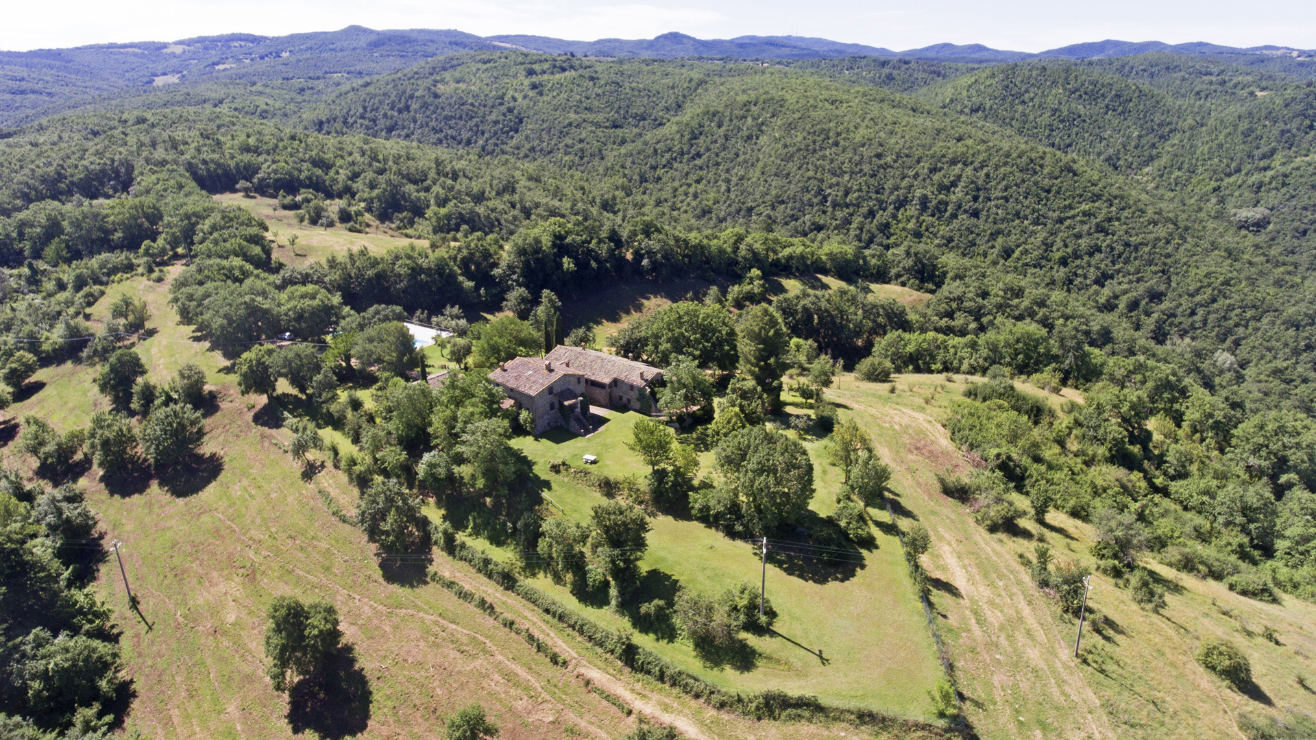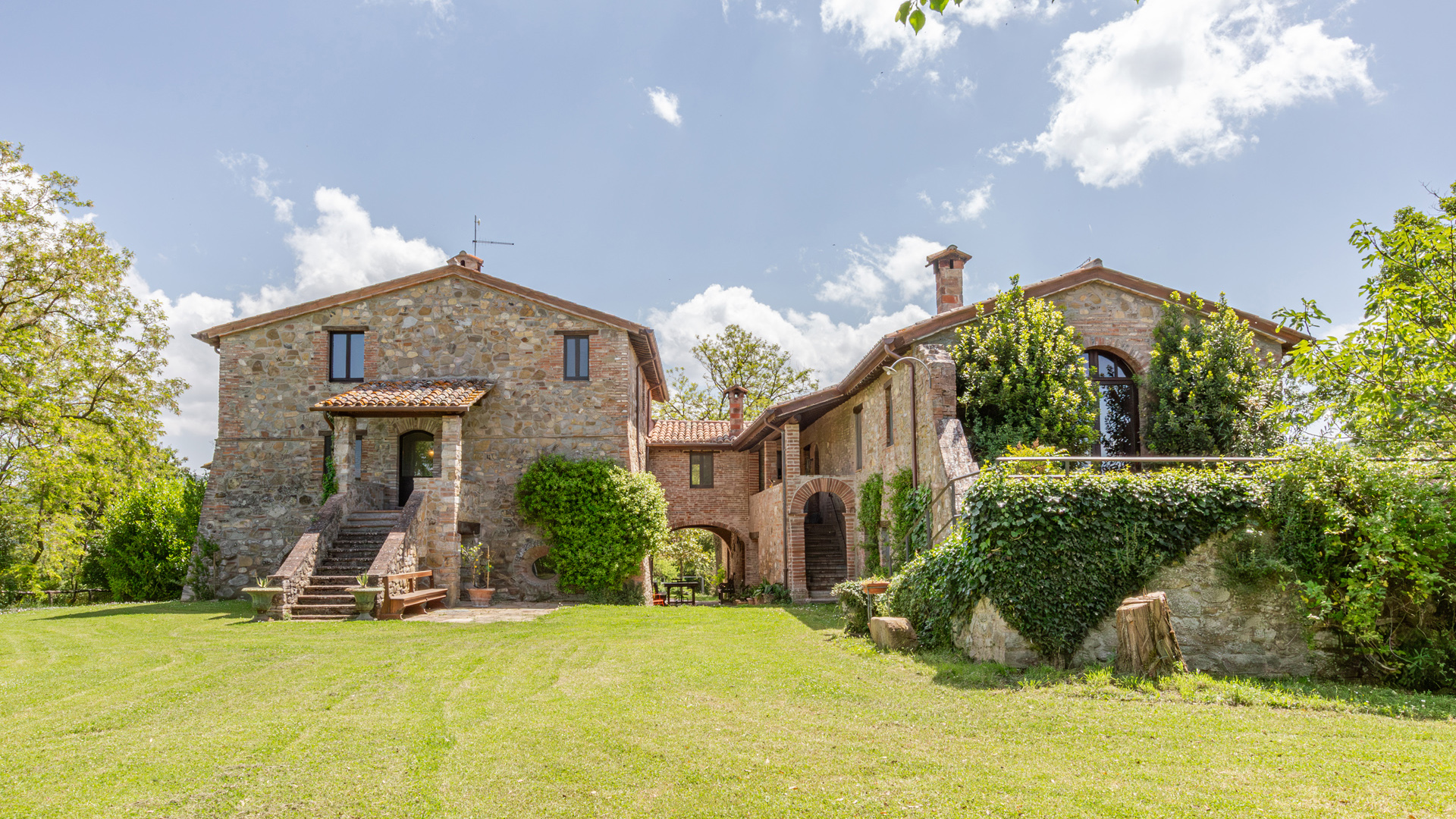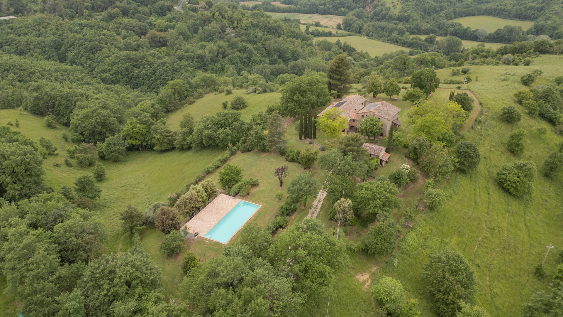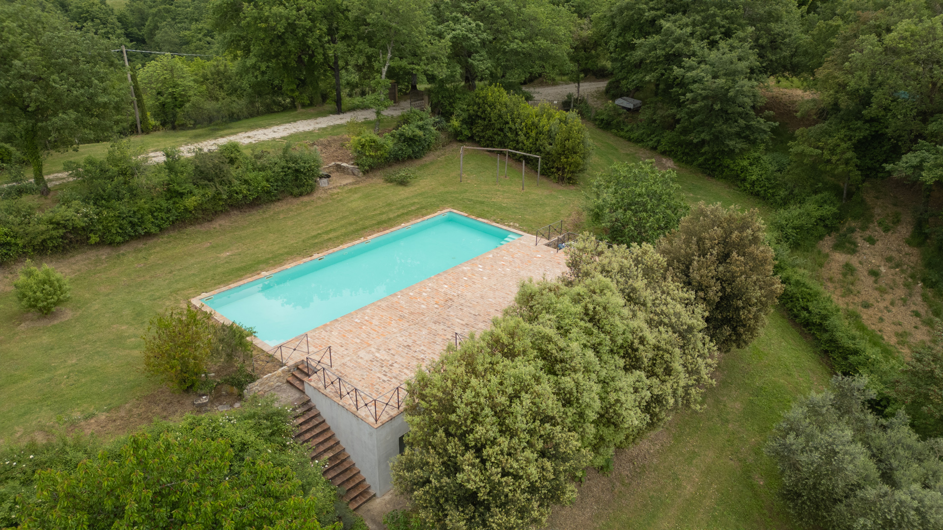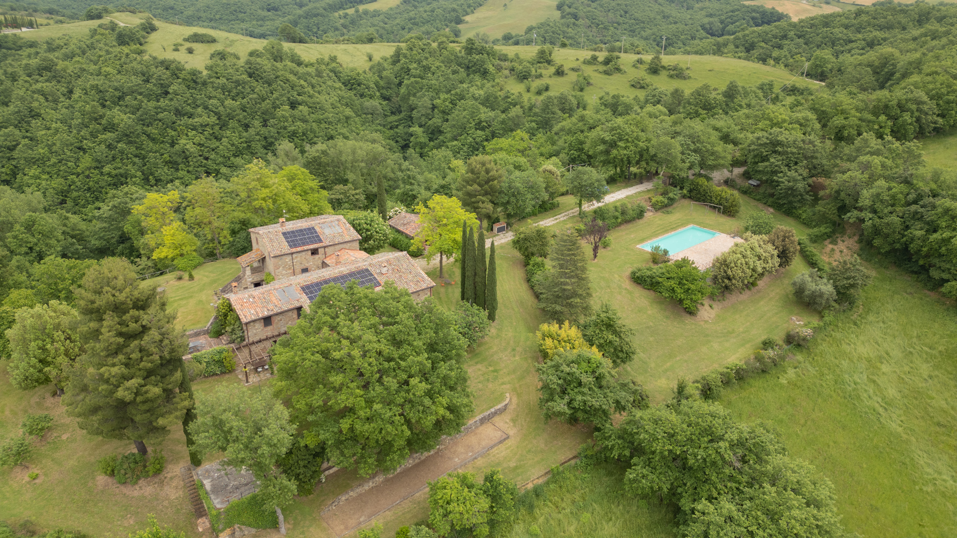 Nieruchomość położona jest na wzgórzu (480 metrów nad poziomem morza) z widokiem na piękną i nieskażoną dolinę Umbrii, bogatą w lasy i łagodne grzbiety. Zbudowana w pobliżu starożytnej etruskiej drogi, która łączyła Orvieto i Perugię z Toskanią, nieruchomość została odnowiona w dwuletnim okresie 2022-2023, zachowując autentyczność i rustykalny urok XVII-wiecznej wioski. Jest teraz podzielony na 4 komfortowe niezależne apartamenty o łącznej powierzchni około 735 m2, plus taras o powierzchni 50 m2, ganek o powierzchni 10 m2, aneks rolniczy o powierzchni 37 m2 (dawniej mały kościół), garaż o powierzchni 18 m2 i inne pomieszczenia techniczne o łącznej powierzchni około 66 m2. Główny budynek jest podzielony na 3 poziomy. Na parterze: w lewym skrzydle znajdują się 2 duże salony i pomieszczenia techniczne, natomiast w prawym skrzydle znajduje się wejście, jadalnia, duża kuchnia, sypialnia z aneksem kuchennym, łazienka i dwa inne pomieszczenia gospodarcze. Pierwsze piętro: do lewego skrzydła prowadzą zewnętrzne schody i kolejne schody z loggią – wewnątrz znajduje się duże wejście / salon, 2 sypialnie i łazienka. Do prawego skrzydła wchodzi się przez dwa wejścia: pierwsze z zewnętrznej klatki schodowej z loggią, a drugie z pięknego tarasu. Wchodząc z loggii, znajdziemy kuchnię, sypialnię i łazienkę; z innych drzwi loggii wchodzimy do innego mieszkania składającego się z 3 sypialni, dwóch łazienek, dużej jadalni, kuchni i salonu z pięknymi drzwiami, które otwierają się na taras. Na drugim piętrze, do którego prowadzą wewnętrzne schody łączące pierwsze piętro, znajdują się 3 niezależne sypialnie i 3 łazienki. Nieruchomość otoczona jest pięknym panoramicznym ogrodem o powierzchni około 9 400 m2, w którym znajduje się duży basen o wymiarach 6×17 metrów z dołączonymi przebieralniami, które można również wykorzystać do innych celów. Możliwość zakupu dodatkowych 9 hektarów ziemi.