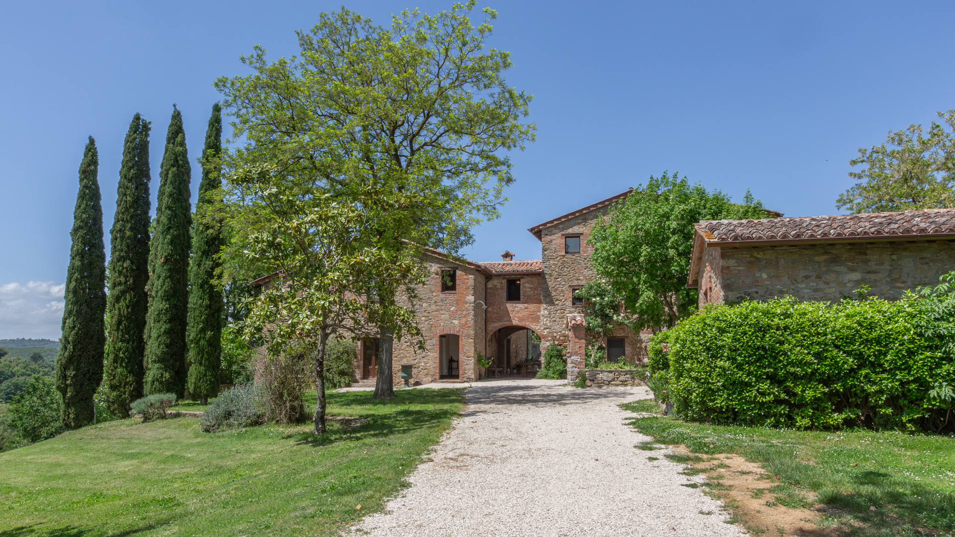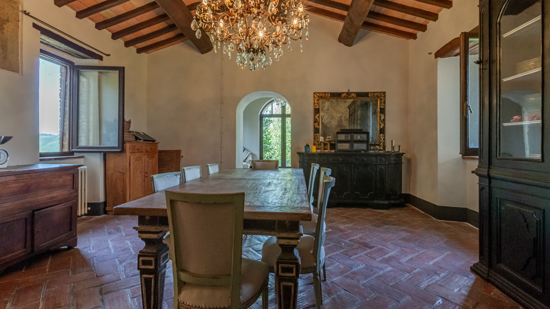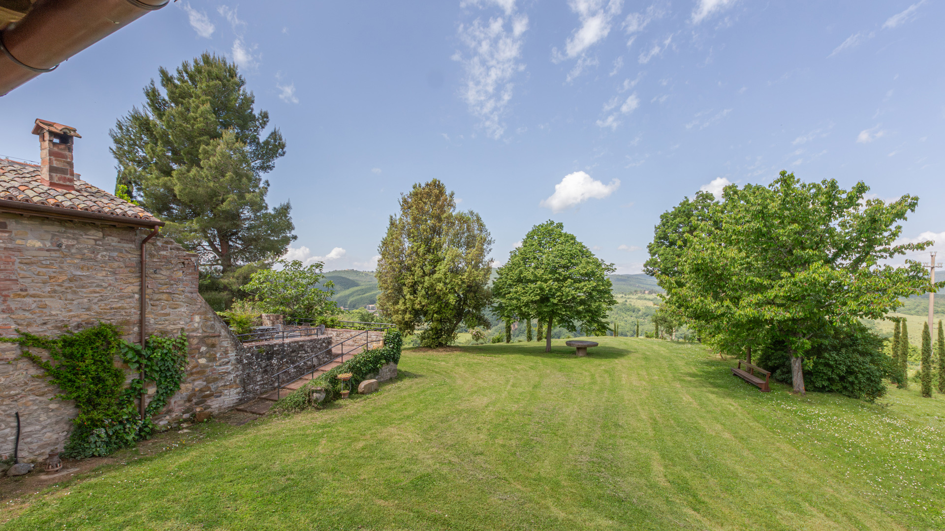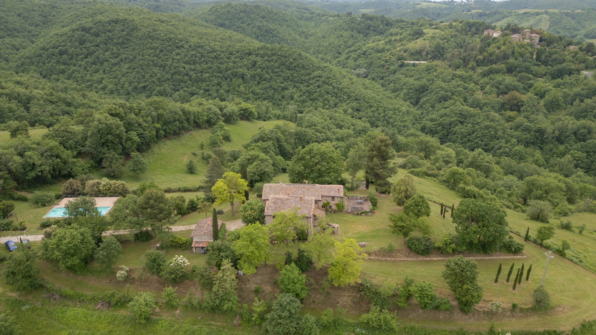 Nieruchomość położona jest na wzgórzu (480 metrów nad poziomem morza) z widokiem na piękną i nieskażoną dolinę Umbrii, bogatą w lasy i łagodne grzbiety. Zbudowana w pobliżu starożytnej etruskiej drogi, która łączyła Orvieto i Perugię z Toskanią, nieruchomość została odnowiona w dwuletnim okresie 2022-2023, zachowując autentyczność i rustykalny urok XVII-wiecznej wioski. Jest teraz podzielony na 4 komfortowe niezależne apartamenty o łącznej powierzchni około 735 m2, plus taras o powierzchni 50 m2, ganek o powierzchni 10 m2, aneks rolniczy o powierzchni 37 m2 (dawniej mały kościół), garaż o powierzchni 18 m2 i inne pomieszczenia techniczne o łącznej powierzchni około 66 m2. Główny budynek jest podzielony na 3 poziomy. Na parterze: w lewym skrzydle znajdują się 2 duże salony i pomieszczenia techniczne, natomiast w prawym skrzydle znajduje się wejście, jadalnia, duża kuchnia, sypialnia z aneksem kuchennym, łazienka i dwa inne pomieszczenia gospodarcze. Pierwsze piętro: do lewego skrzydła prowadzą zewnętrzne schody i kolejne schody z loggią – wewnątrz znajduje się duże wejście / salon, 2 sypialnie i łazienka. Do prawego skrzydła wchodzi się przez dwa wejścia: pierwsze z zewnętrznej klatki schodowej z loggią, a drugie z pięknego tarasu. Wchodząc z loggii, znajdziemy kuchnię, sypialnię i łazienkę; z innych drzwi loggii wchodzimy do innego mieszkania składającego się z 3 sypialni, dwóch łazienek, dużej jadalni, kuchni i salonu z pięknymi drzwiami, które otwierają się na taras. Na drugim piętrze, do którego prowadzą wewnętrzne schody łączące pierwsze piętro, znajdują się 3 niezależne sypialnie i 3 łazienki. Nieruchomość otoczona jest pięknym panoramicznym ogrodem o powierzchni około 9 400 m2, w którym znajduje się duży basen o wymiarach 6×17 metrów z dołączonymi przebieralniami, które można również wykorzystać do innych celów. Możliwość zakupu dodatkowych 9 hektarów ziemi.