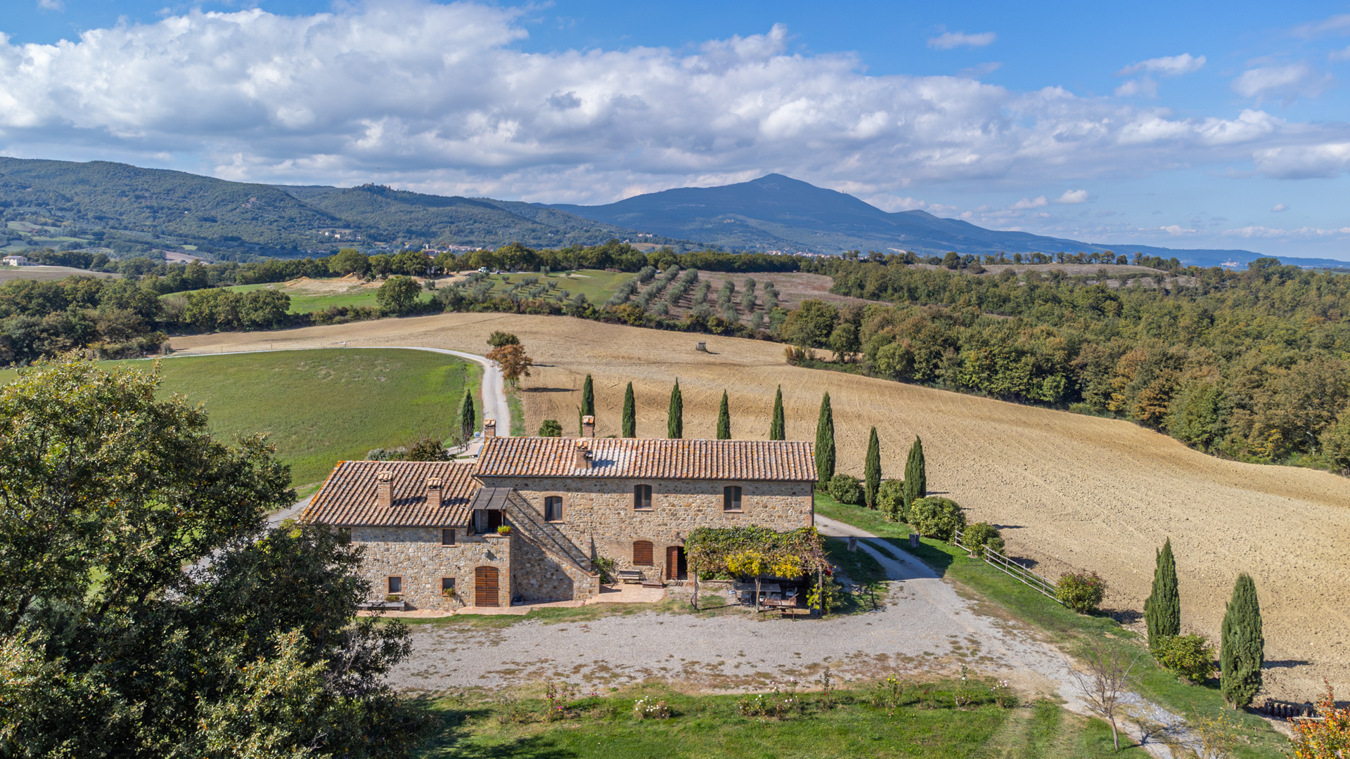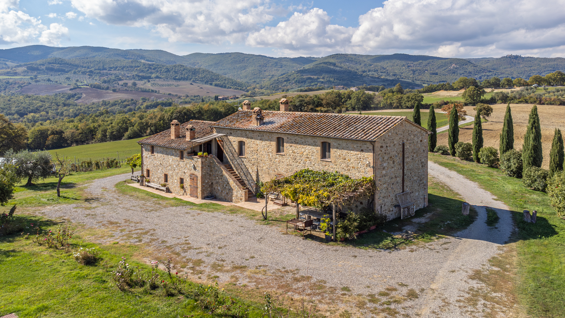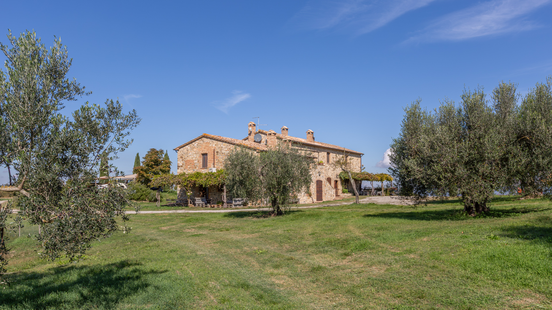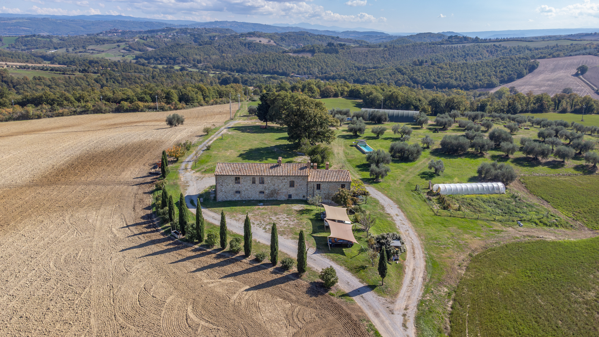Podere Salceto to typowy kamienny dom wiejski, w pełni odrestaurowany na początku 2000 roku. Oferuje on powierzchnię brutto 510 m2, rozłożoną na dwóch poziomach, starannie zaaranżowaną w następujący sposób: na parterze znajduje się część wykorzystywana jako magazyn, inny obszar, w którym zainstalowano łazienkę, kuchnię i dużą salę bilardową. Pokoje te wychodzą na przestronną pergolę, idealną na letnie wieczorne posiłki. Również na parterze, z niezależnym dostępem, znajduje się apartament składający się z kuchni, salonu, łazienki i sypialni. Ten apartament ma własną przestrzeń na zewnątrz, gdzie stworzono letnią część wypoczynkową. Wchodząc po zabytkowych kamiennych i ceglanych schodach, można dotrzeć do loggii z funkcjonalnym starym piecem opalanym drewnem i jadalnią na świeżym powietrzu. Na tym piętrze znajdują się cztery sypialnie, trzy łazienki, duża rustykalna kuchnia i salon z zabytkowym kominkiem. Na zewnątrz znajduje się duża fontanna (o wymiarach 9 x 2,5 m i wysokości 2 m), w której można się orzeźwić w gorące letnie dni. Posiadłość rozciąga się na około 51 hektarach, podzielonych na około 1,2 hektara zalesionych pastwisk, około 23 hektary zagajników i lasów mieszanych, około 26 hektarów gruntów ornych, około 0,5 hektara sadów i około 2,05 hektara gajów oliwnych klasy A. Dodatkowo, dwa lata temu zbudowano tunel rolniczy o powierzchni 250 m2 do przechowywania maszyn.