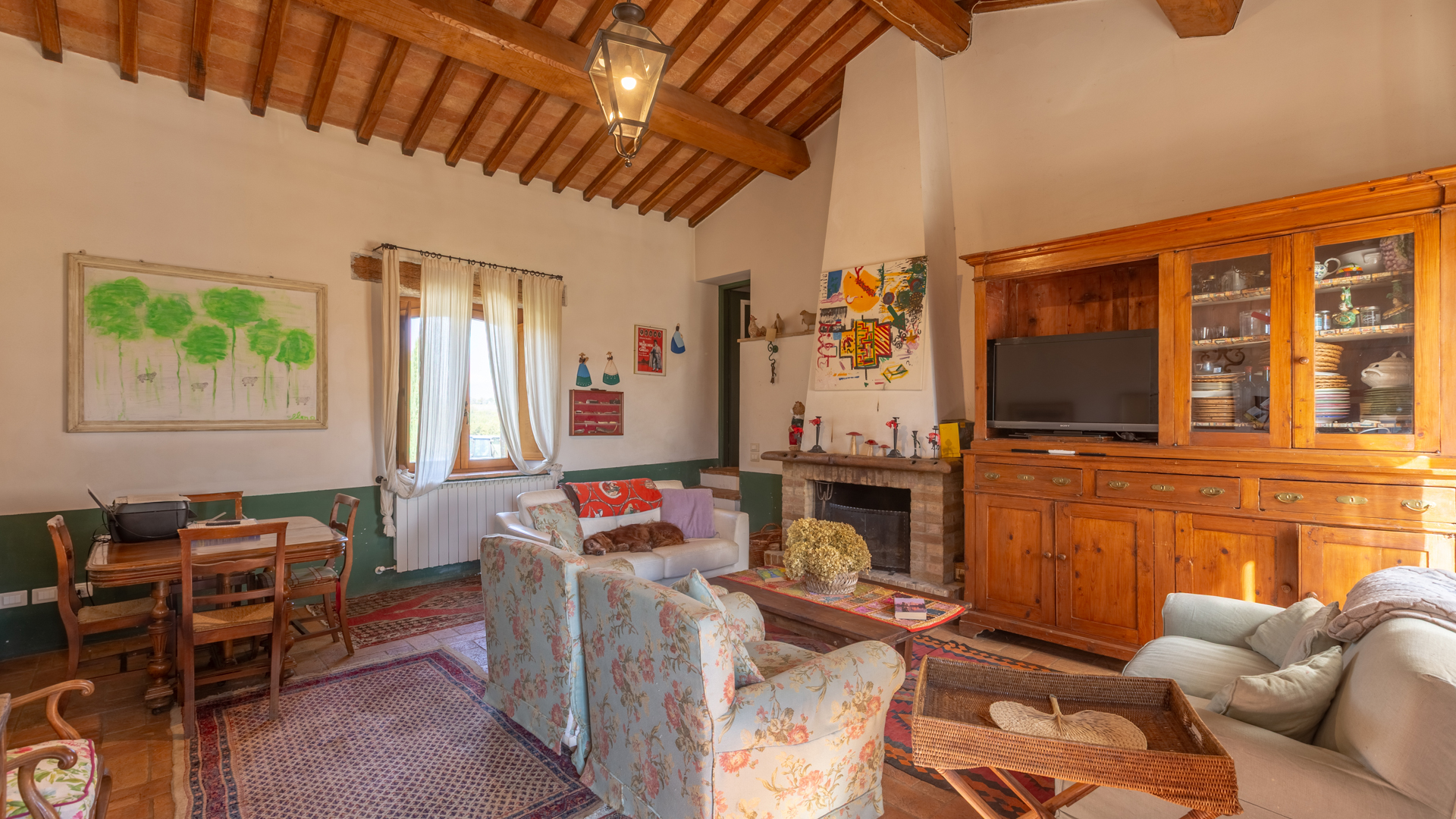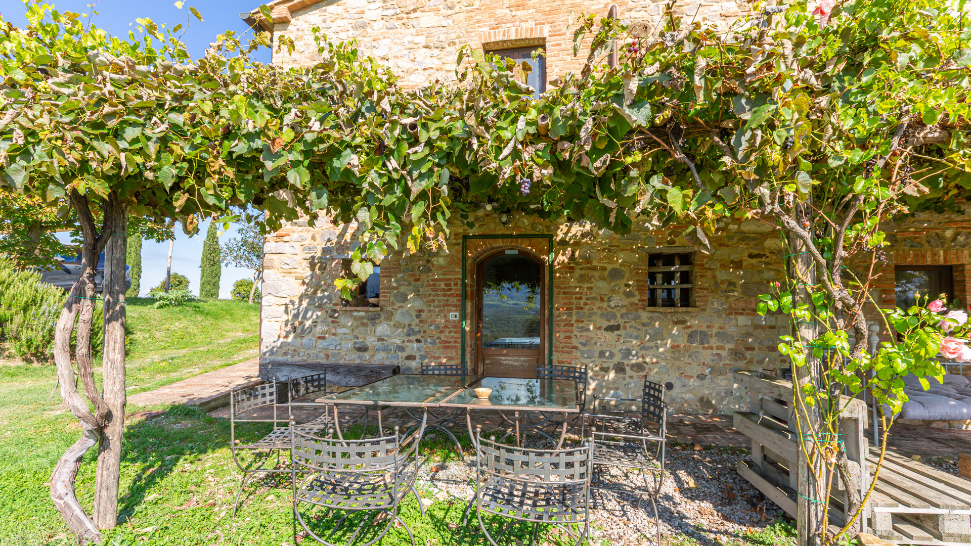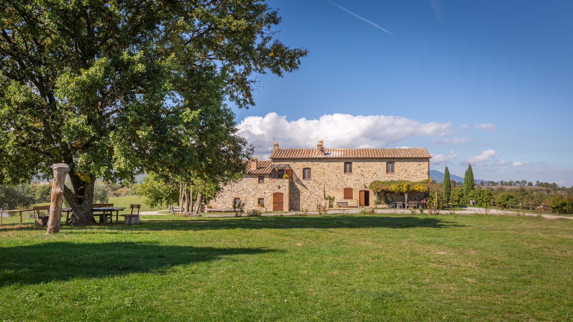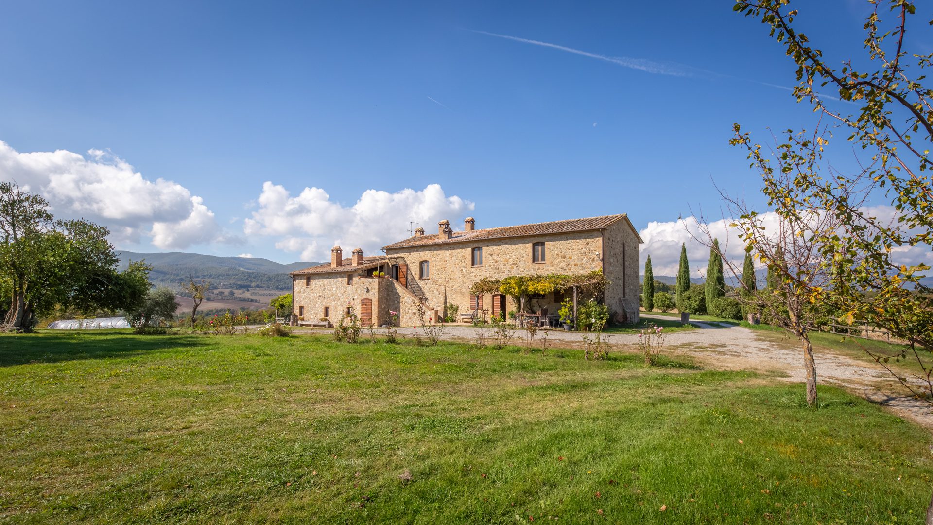 Podere Salceto to typowy kamienny dom wiejski, w pełni odrestaurowany na początku 2000 roku. Oferuje on powierzchnię brutto 510 m2, rozłożoną na dwóch poziomach, starannie zaaranżowaną w następujący sposób: na parterze znajduje się część wykorzystywana jako magazyn, inny obszar, w którym zainstalowano łazienkę, kuchnię i dużą salę bilardową. Pokoje te wychodzą na przestronną pergolę, idealną na letnie wieczorne posiłki. Również na parterze, z niezależnym dostępem, znajduje się apartament składający się z kuchni, salonu, łazienki i sypialni. Ten apartament ma własną przestrzeń na zewnątrz, gdzie stworzono letnią część wypoczynkową. Wchodząc po zabytkowych kamiennych i ceglanych schodach, można dotrzeć do loggii z funkcjonalnym starym piecem opalanym drewnem i jadalnią na świeżym powietrzu. Na tym piętrze znajdują się cztery sypialnie, trzy łazienki, duża rustykalna kuchnia i salon z zabytkowym kominkiem. Na zewnątrz znajduje się duża fontanna (o wymiarach 9 x 2,5 m i wysokości 2 m), w której można się orzeźwić w gorące letnie dni. Posiadłość rozciąga się na około 51 hektarach, podzielonych na około 1,2 hektara zalesionych pastwisk, około 23 hektary zagajników i lasów mieszanych, około 26 hektarów gruntów ornych, około 0,5 hektara sadów i około 2,05 hektara gajów oliwnych klasy A. Dodatkowo, dwa lata temu zbudowano tunel rolniczy o powierzchni 250 m2 do przechowywania maszyn.