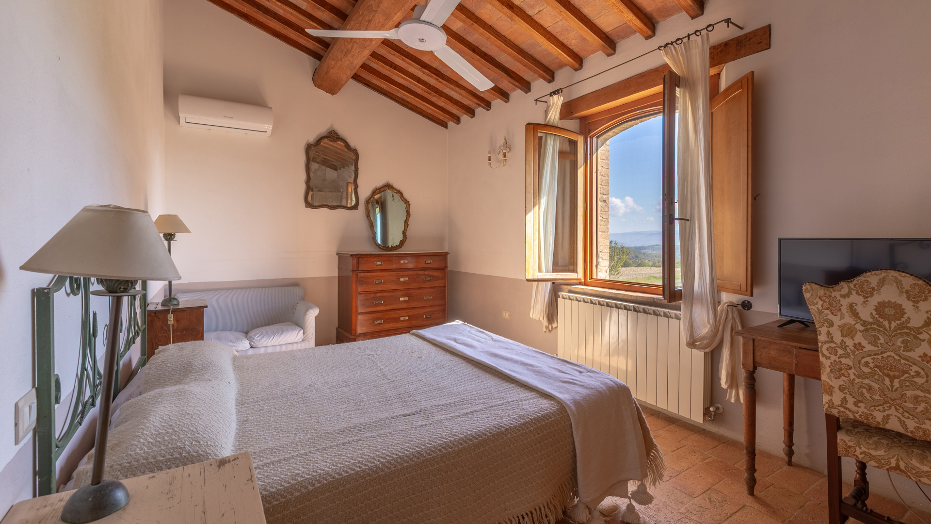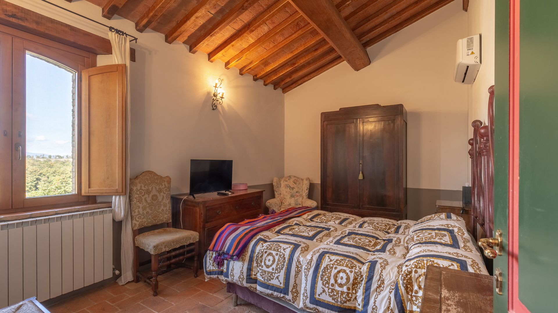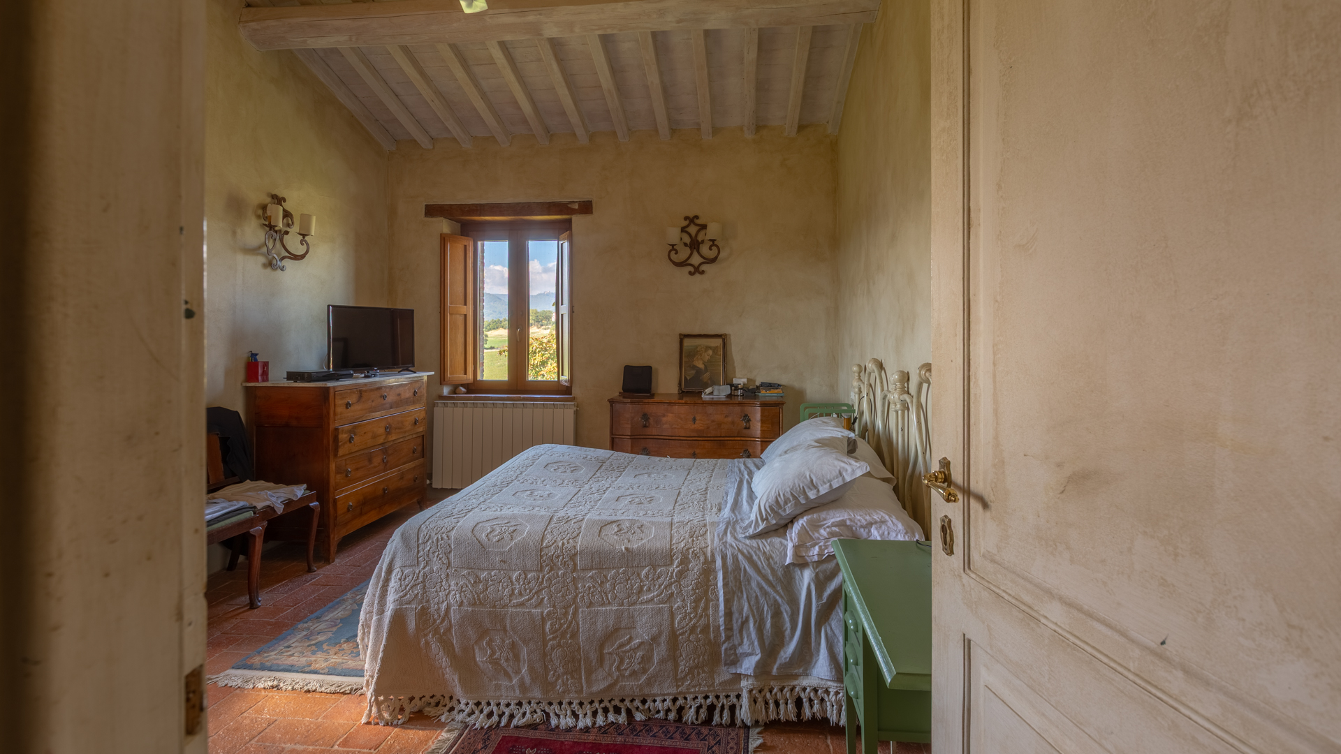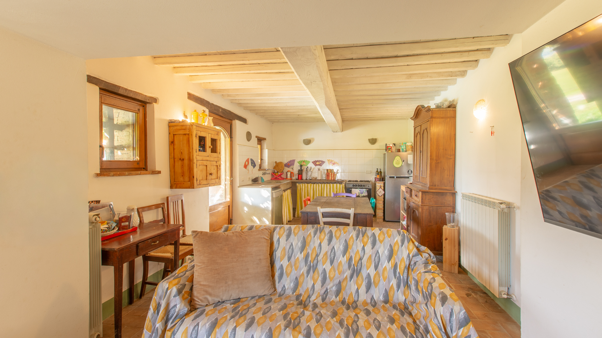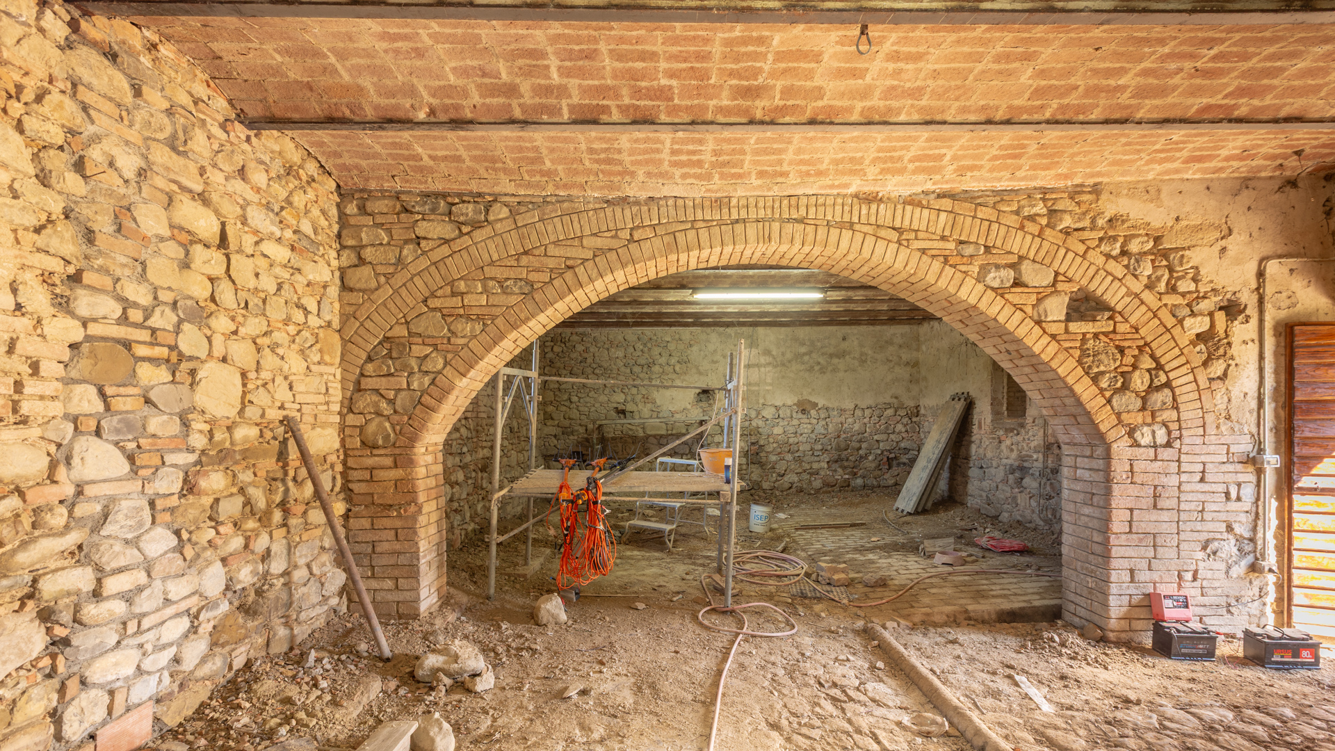 Podere Salceto to typowy kamienny dom wiejski, w pełni odrestaurowany na początku 2000 roku. Oferuje on powierzchnię brutto 510 m2, rozłożoną na dwóch poziomach, starannie zaaranżowaną w następujący sposób: na parterze znajduje się część wykorzystywana jako magazyn, inny obszar, w którym zainstalowano łazienkę, kuchnię i dużą salę bilardową. Pokoje te wychodzą na przestronną pergolę, idealną na letnie wieczorne posiłki. Również na parterze, z niezależnym dostępem, znajduje się apartament składający się z kuchni, salonu, łazienki i sypialni. Ten apartament ma własną przestrzeń na zewnątrz, gdzie stworzono letnią część wypoczynkową. Wchodząc po zabytkowych kamiennych i ceglanych schodach, można dotrzeć do loggii z funkcjonalnym starym piecem opalanym drewnem i jadalnią na świeżym powietrzu. Na tym piętrze znajdują się cztery sypialnie, trzy łazienki, duża rustykalna kuchnia i salon z zabytkowym kominkiem. Na zewnątrz znajduje się duża fontanna (o wymiarach 9 x 2,5 m i wysokości 2 m), w której można się orzeźwić w gorące letnie dni. Posiadłość rozciąga się na około 51 hektarach, podzielonych na około 1,2 hektara zalesionych pastwisk, około 23 hektary zagajników i lasów mieszanych, około 26 hektarów gruntów ornych, około 0,5 hektara sadów i około 2,05 hektara gajów oliwnych klasy A. Dodatkowo, dwa lata temu zbudowano tunel rolniczy o powierzchni 250 m2 do przechowywania maszyn.