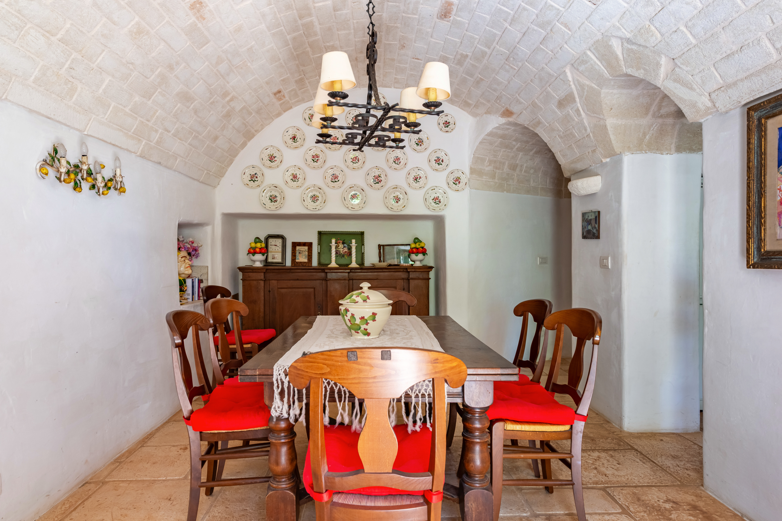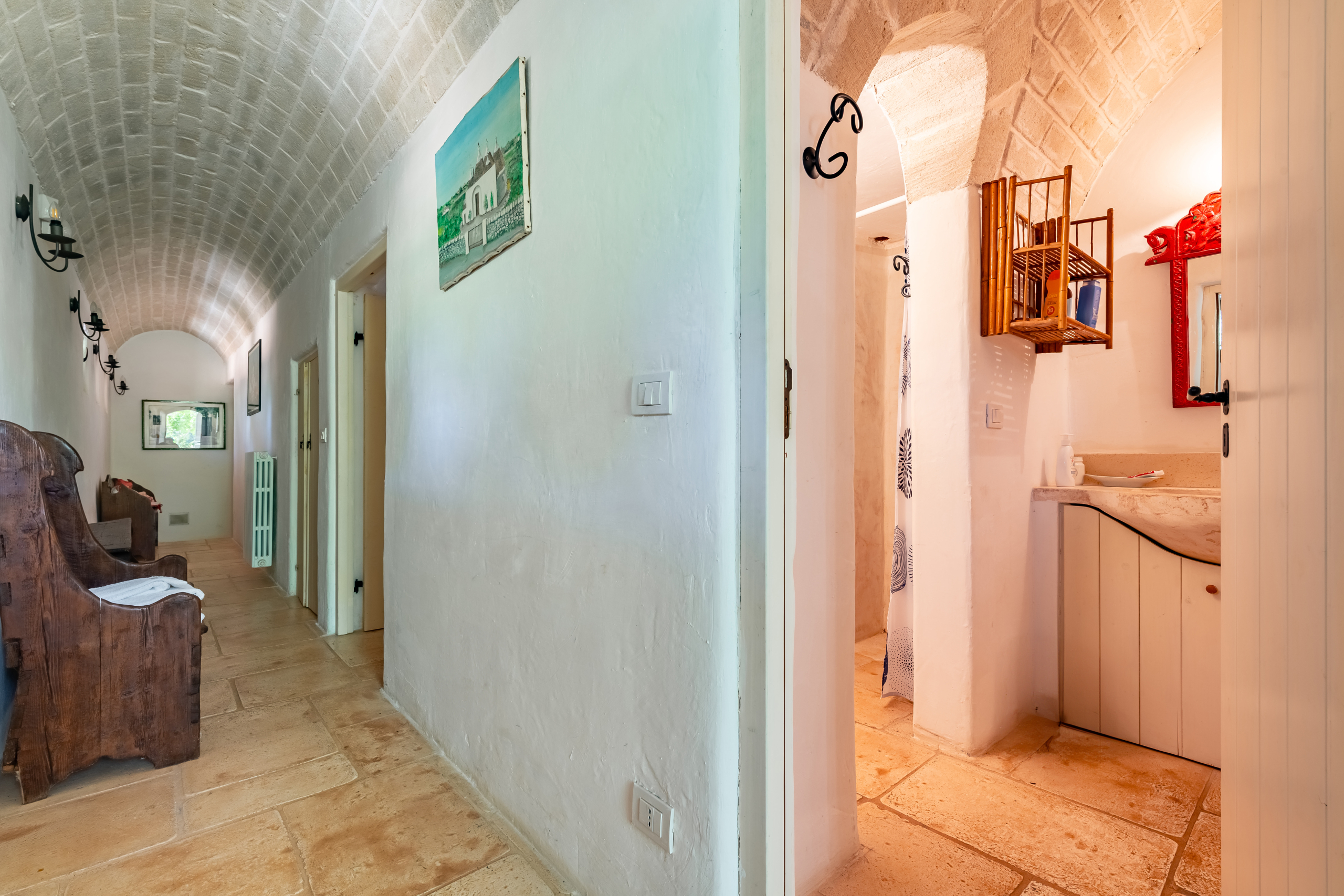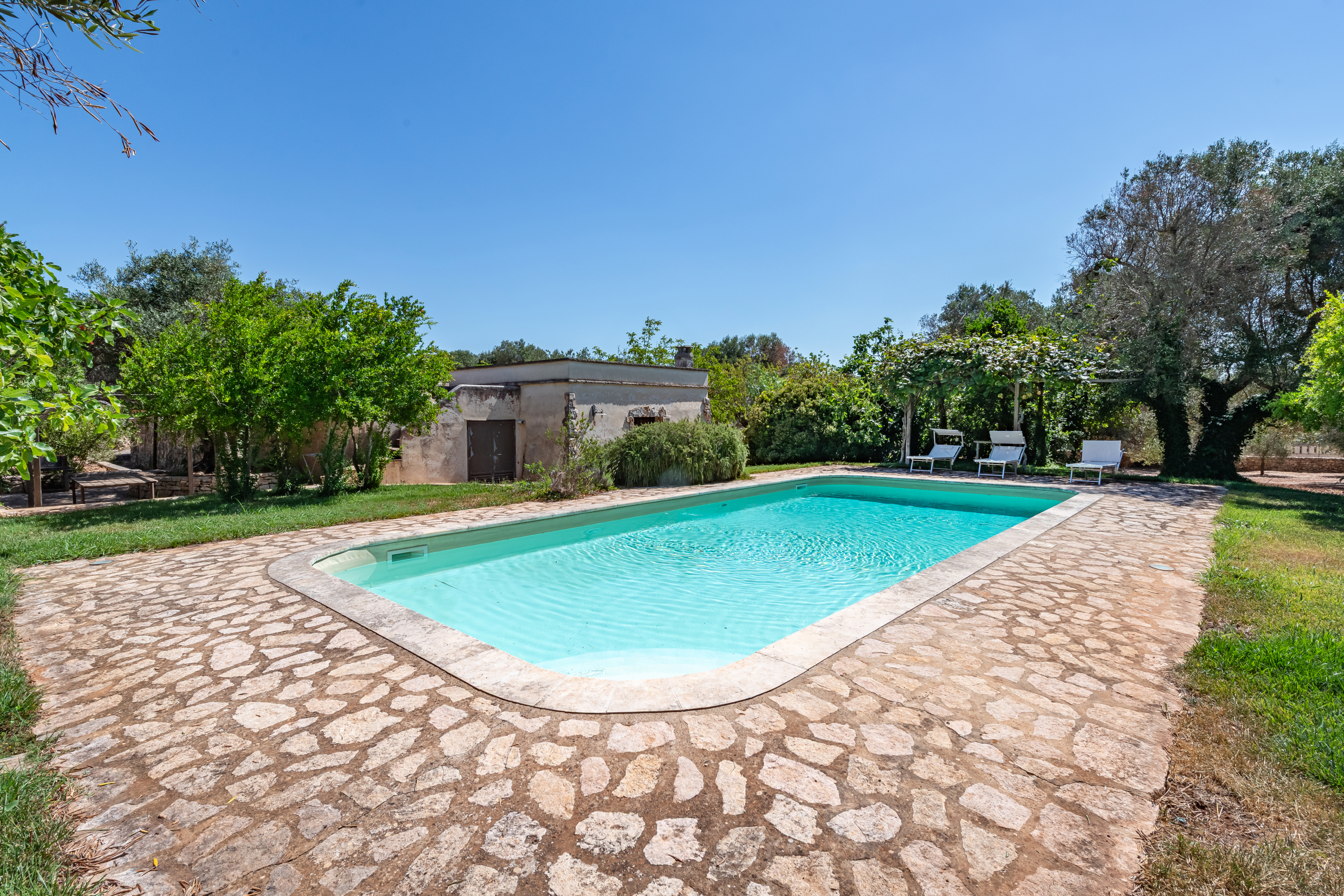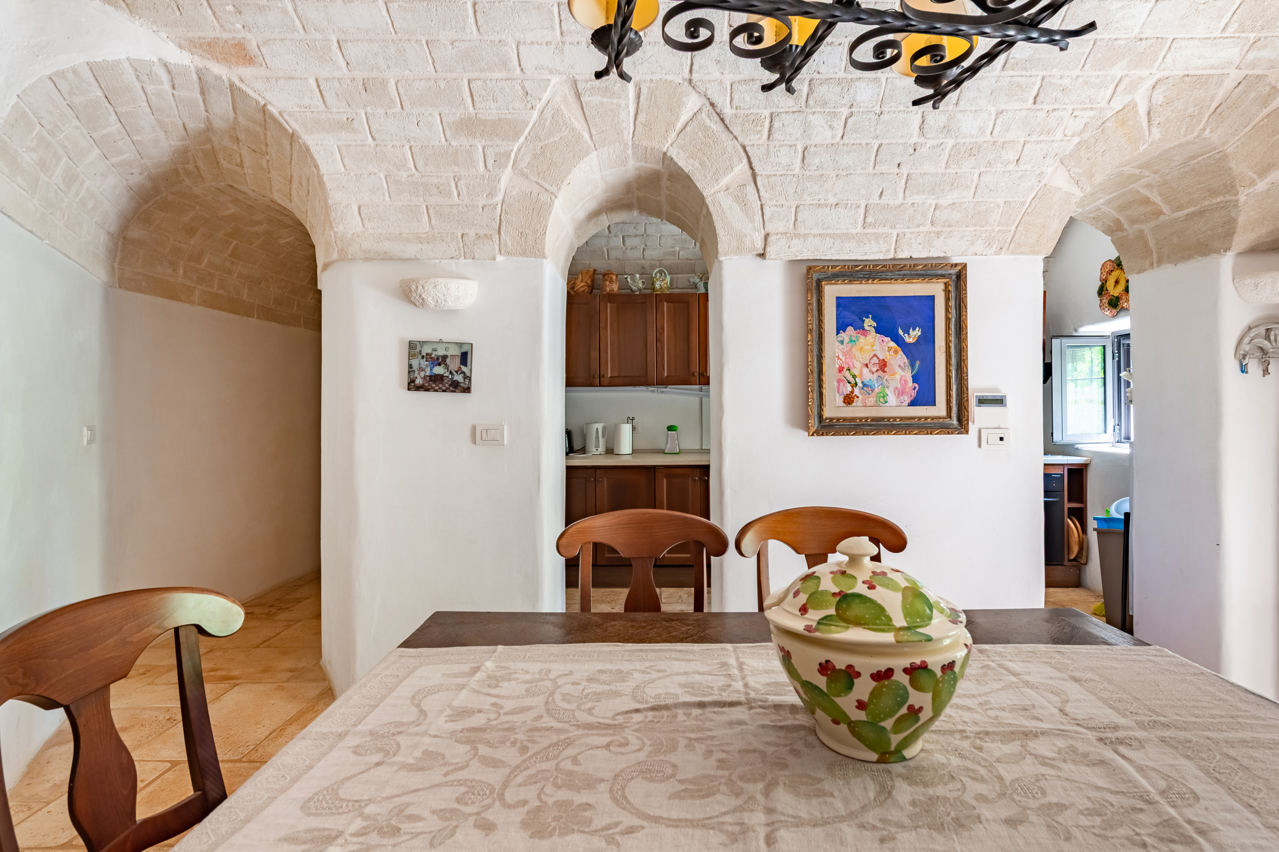 Główna rezydencja została starannie odrestaurowana, aby zachować autentyczny urok oryginalnych trulli, oferując przytulne wnętrza wzbogacone oryginalnymi podłogami z kamienia chianche i detalami z naturalnego kamienia. Na zewnątrz prywatny basen harmonijnie komponuje się z naturalnym otoczeniem. Jest on bardzo przestronny i wyposażony w wyłożone kamieniem solarium – idealne miejsce na relaks w ciepłe, słoneczne dni. W pobliżu znajduje się tradycyjny piec opalany drewnem, który zachęca do spożywania posiłków na świeżym powietrzu w prawdziwym stylu apulijskim.