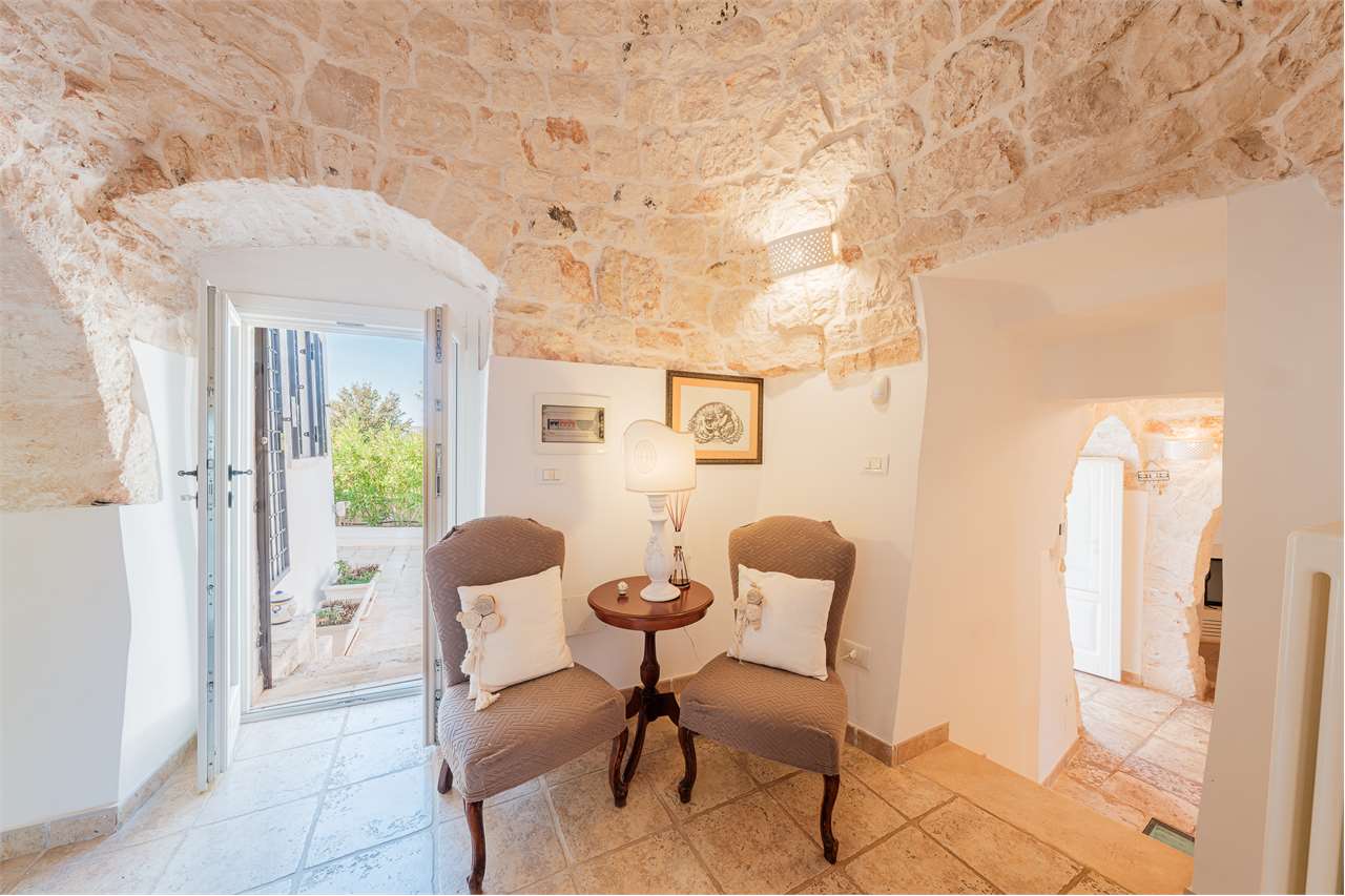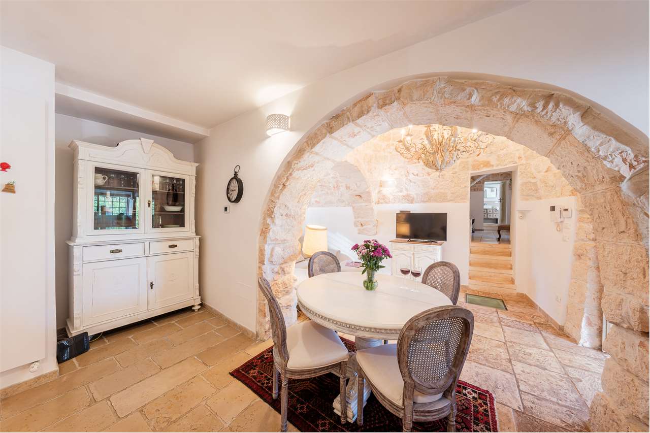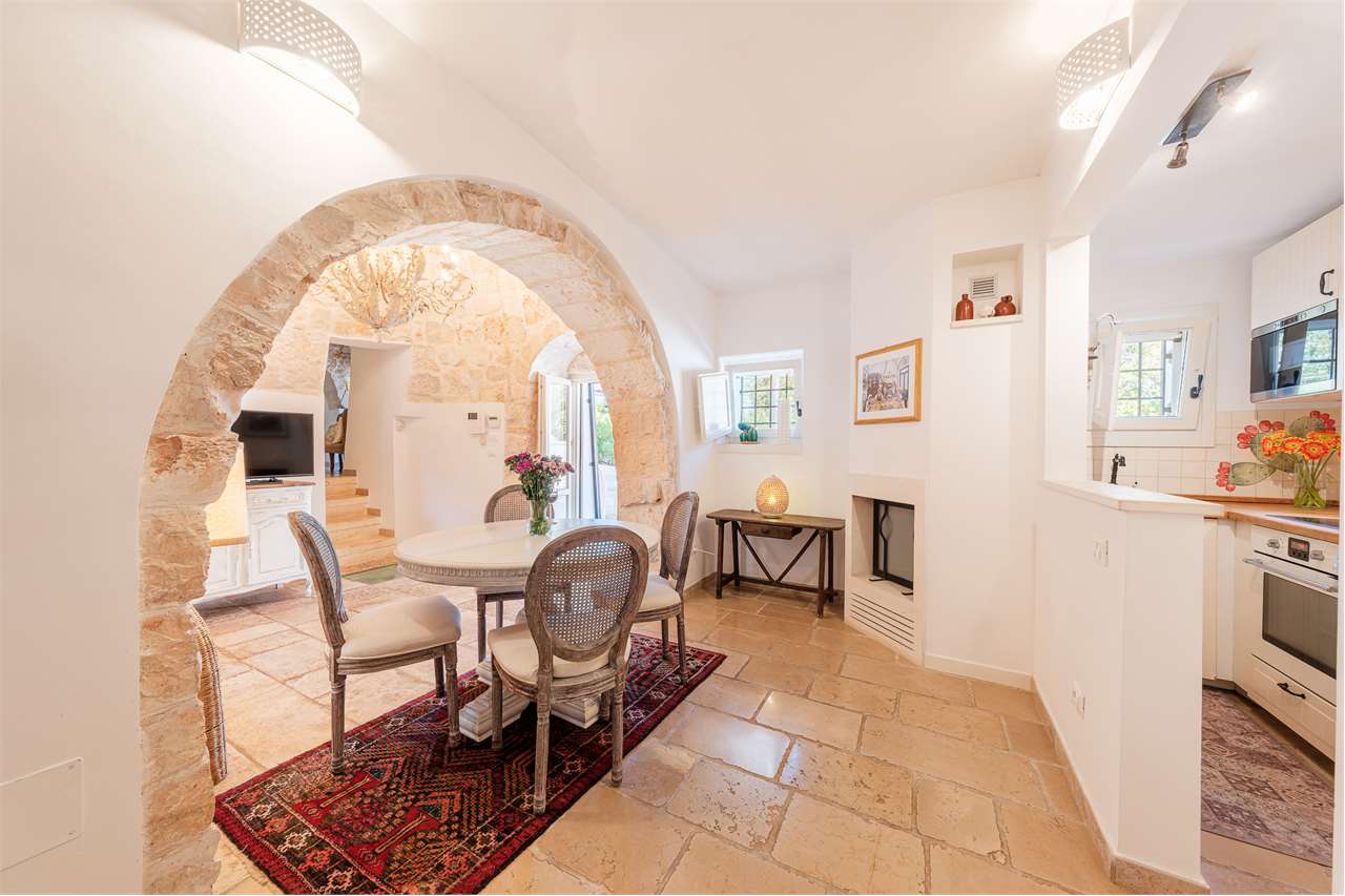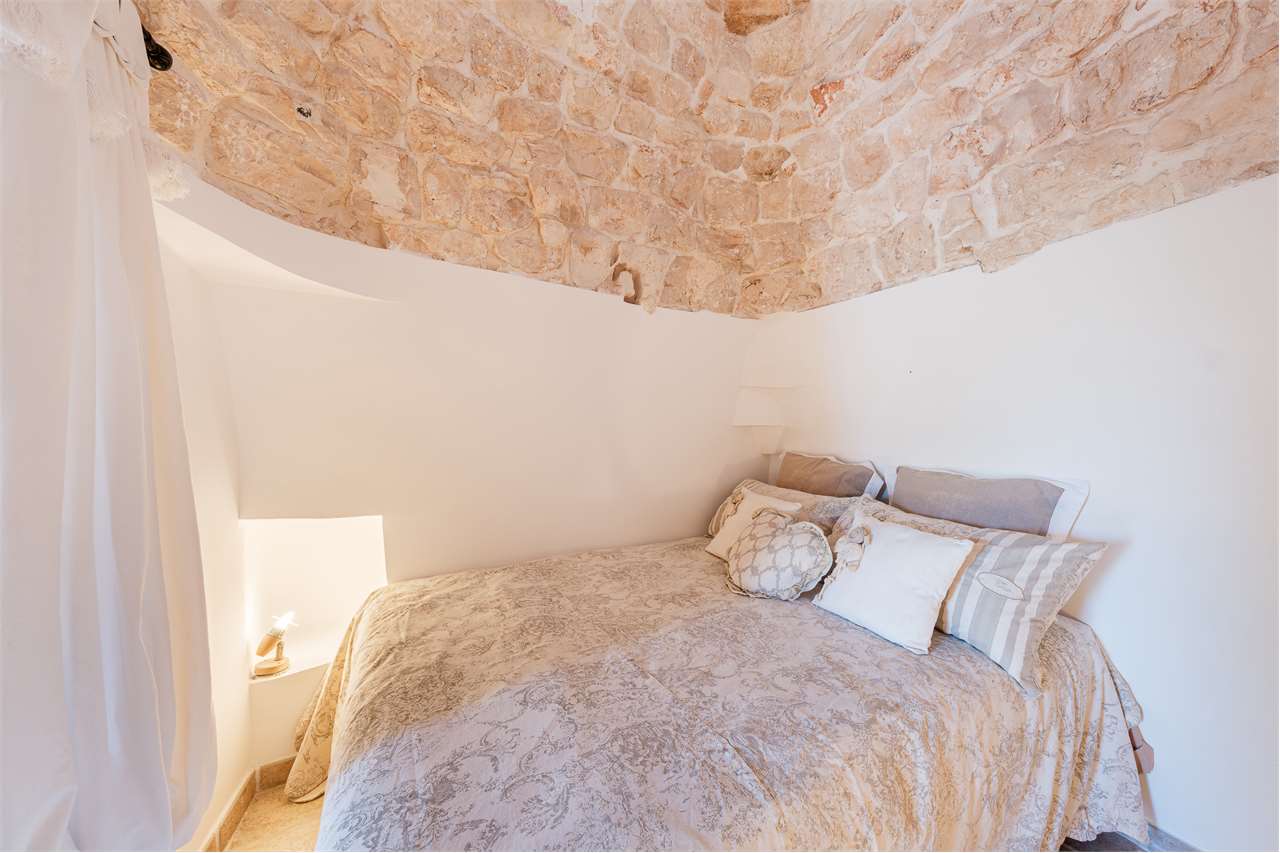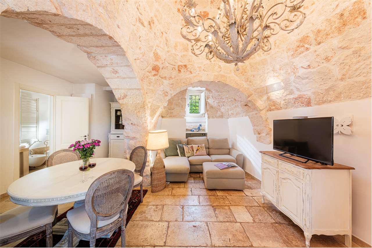 Ta wyjątkowa nieruchomość składa się z labiryntu 5 stożkowych trulli i lamii, połączonych schodami, które oddzielają część dzienną od sypialnej, tworząc mistyczną, ale ciepłą i przyjazną atmosferę. Wnętrze zachowało swój rustykalny urok dzięki sklepionym sufitom i odsłoniętym kamiennym ścianom – to naprawdę jedyne w swoim rodzaju doświadczenie!