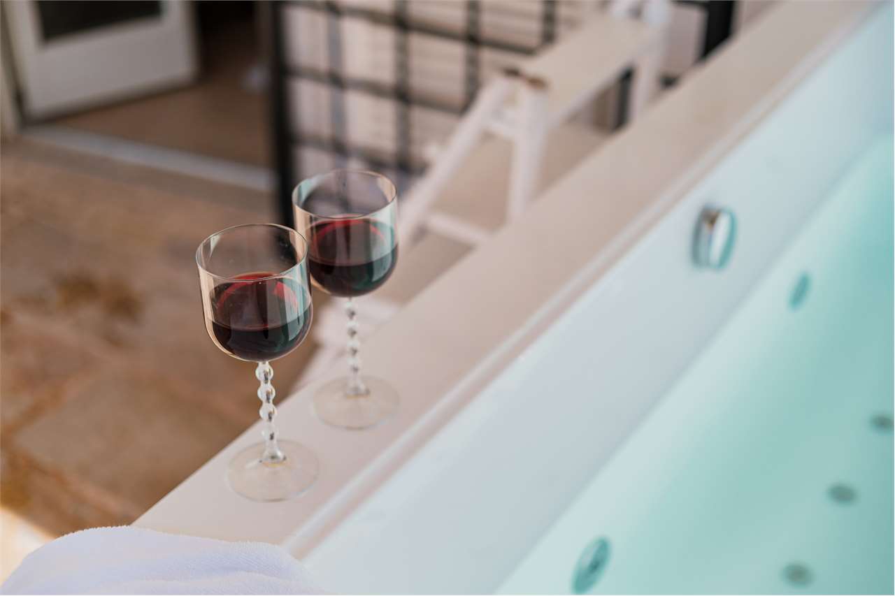 Wyróżniającym się elementem jest pokój spa, luksusowa przestrzeń ze szklanymi ścianami, z widokiem na basen i ogród, oferująca idealne warunki do relaksu i odpoczynku w otoczeniu natury. Wanna z jacuzzi w pokoju zapewnia chwile absolutnego dobrego samopoczucia i spokoju.