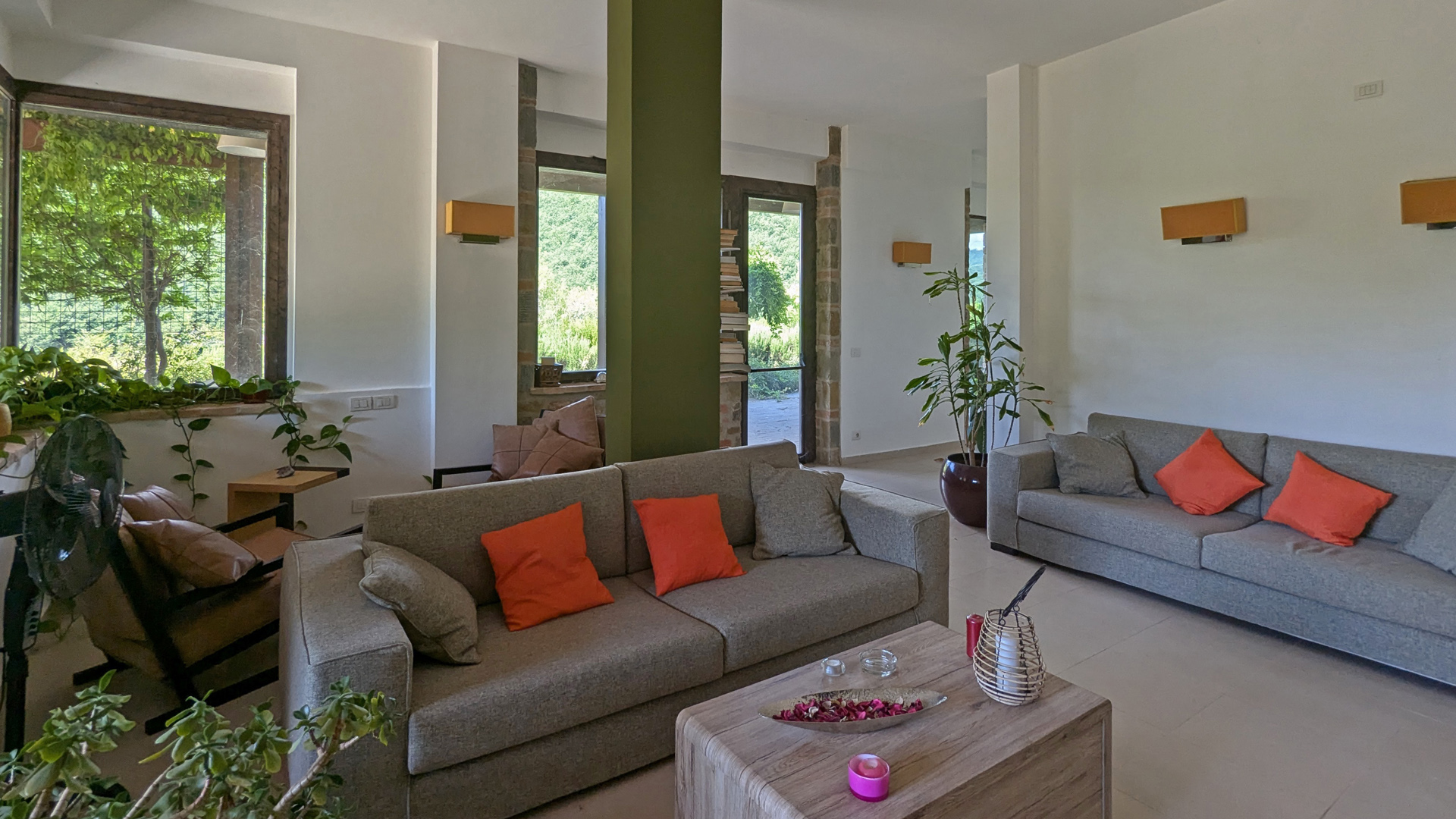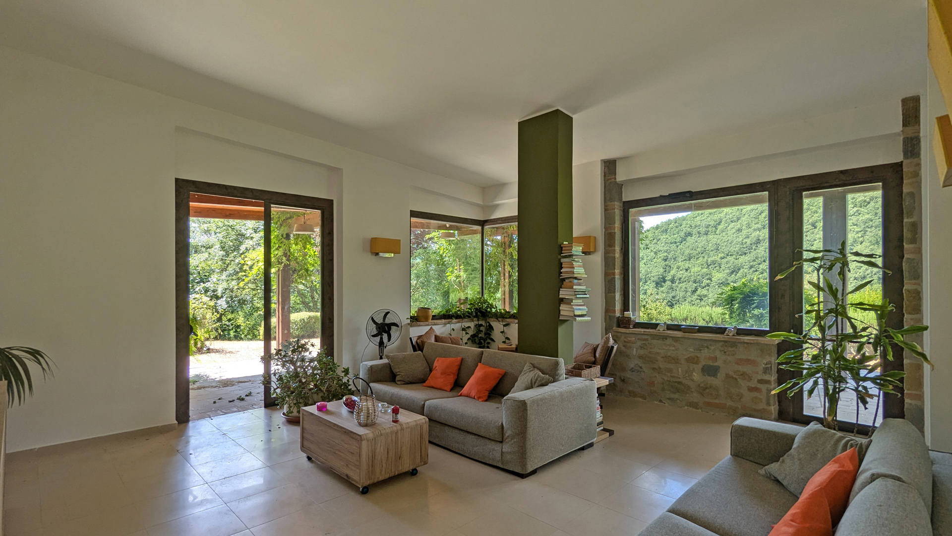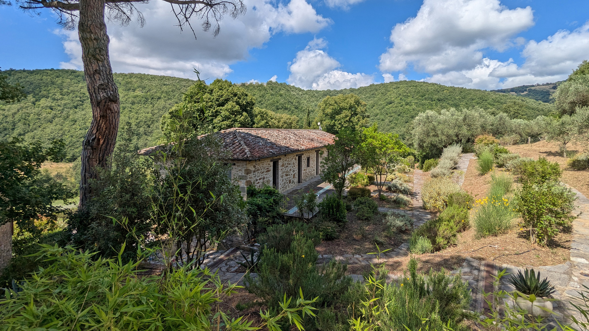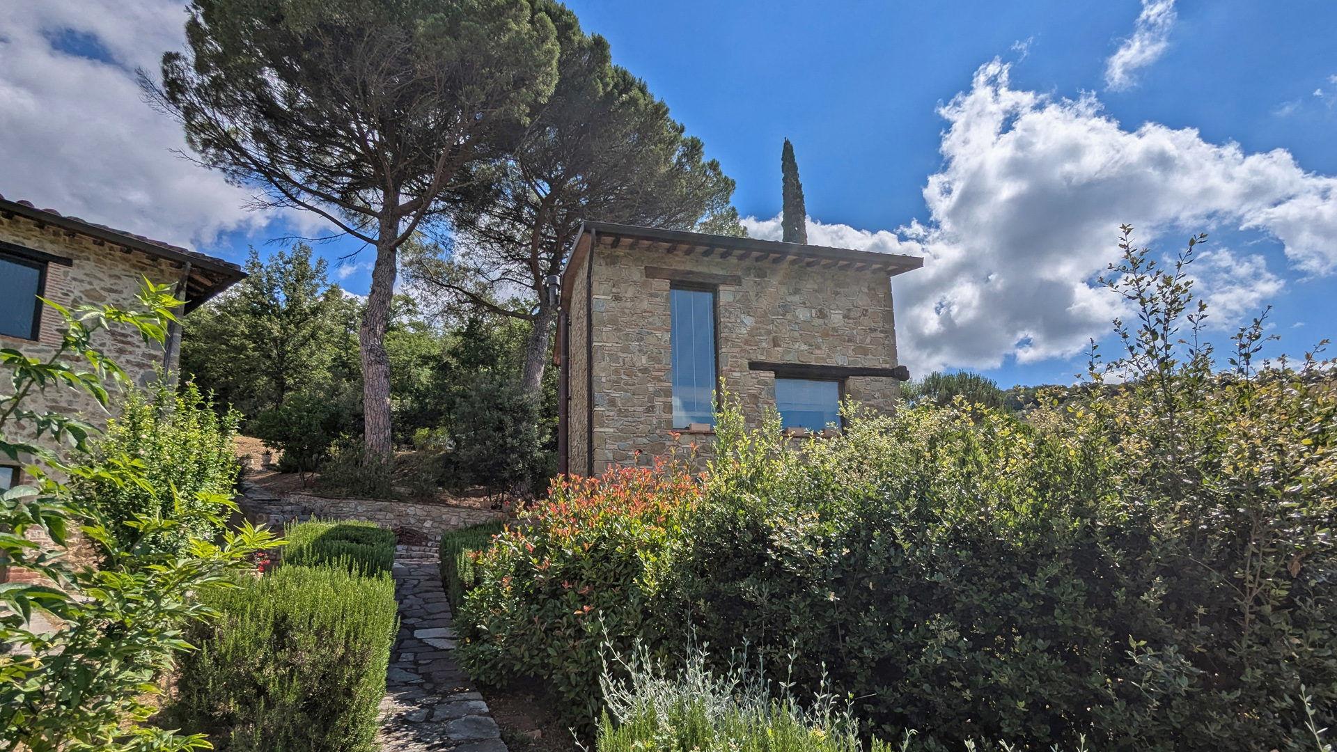 Nieruchomość składa się z trzech budynków, z których każdy pełni inną funkcję. Dawny dwór posiada obecnie 14 apartamentów, każdy z niezależnym wejściem z bezpośrednim dostępem do ogrodu i spektakularnym widokiem na las. Następnie znajduje się drugi budynek wieżowy na trzech piętrach, składający się z jadalni-salonu i dwóch sypialni z łazienką, zaprojektowany jako dom dla właściciela. Trzeci budynek znajduje się na jednym piętrze i tutaj znajduje się pierwszy duży pokój, idealny do rozmów lub kursów jogi, jadalnia, profesjonalna kuchnia, dwa pomieszczenia używane jako spiżarnia/magazyn, dwie łazienki i duża weranda na śniadania i kolacje na świeżym powietrzu. Ogród otaczający nieruchomość mierzy około 1,5 hektara, ma trzy wejścia, a wewnątrz znajduje się basen o wymiarach 17 x 5 metrów w zacisznej okolicy. Umeblowanie, minimalistyczne i designerskie, jest wliczone w cenę, podobnie jak wszystkie akcesoria meblowe.